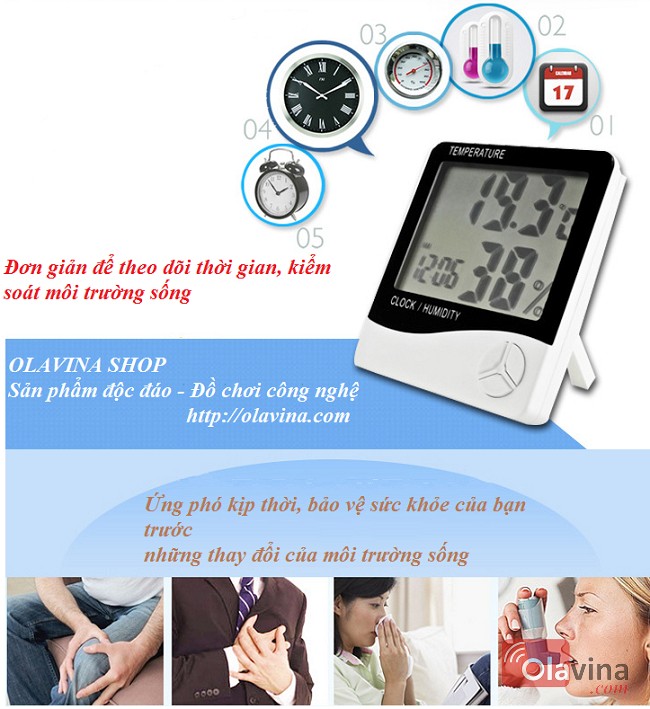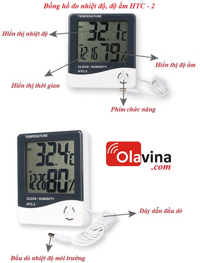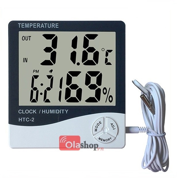 Đồng hồ đo nhiệt độ, độ ẩm HTC - 2 đo độ ẩm, nhiệt độ trong phòng và ngoài môi trường.