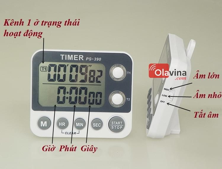 - Chức năng hẹn giờ đếm ngược (timer) với 2 kênh độc lập ( 2 kiểu âm báo khác nhau cho từng kênh dễ dàng phân biệt). Thời gian hẹn lên đến 99 giờ 59 phút 59 giây.