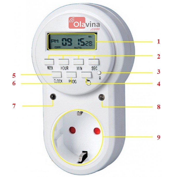 - Prog: Kết hợp với các nút (2) để cài đặt thời gian ON – OFF tự động cho thiết bị.