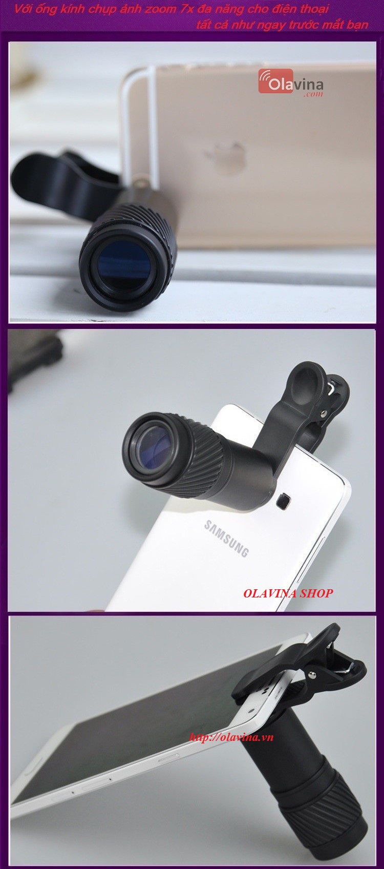 - Ống kính chụp ảnh zoom 7x đa năng cho điện thoại với kẹp đa năng dễ dàng tháo lắp, có đệm cao su bảo vệ không làm trầy xước.